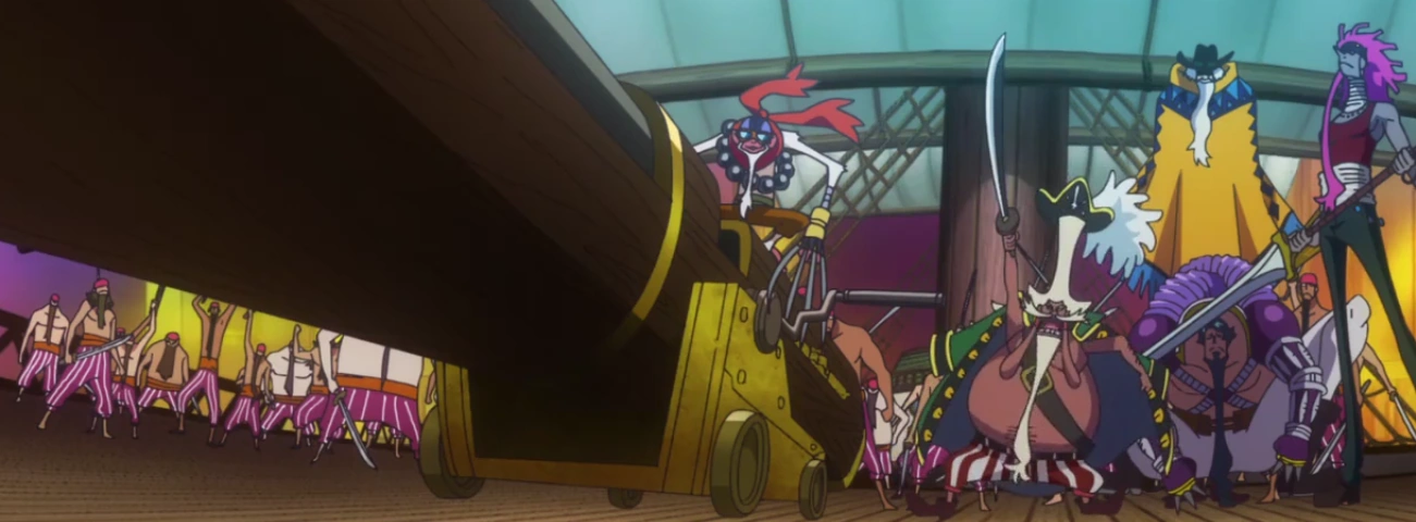 Les pirates Long Long ont plusieurs navires très longs qui sont enchaînés ensemble pour créer un navire unique, incroyablement long. Il a plusieurs mâts et voiles; Le mât principal qui porte leur Jolly Roger est extrêmement grand, mais peut être rétracté afin de passer dans les tunnels. Le mât de navire est un long canon qui est fonctionnel et sert également de pont pour aborder les navires ennemis.[1]