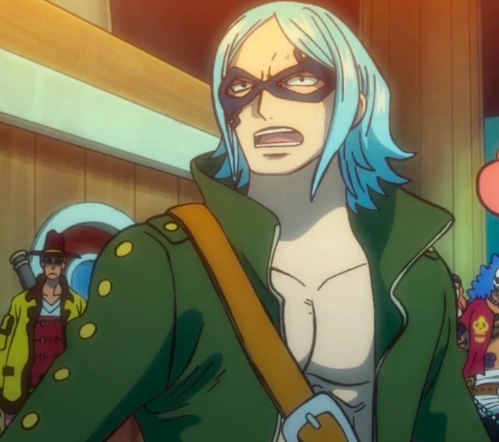 Il porte un masque sur son visage afin de dissimuler sa véritable identité. C'est un homme maigre avec des cheveux bleus. Il a un blouson vert ouvert sur le devant.