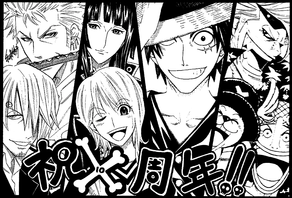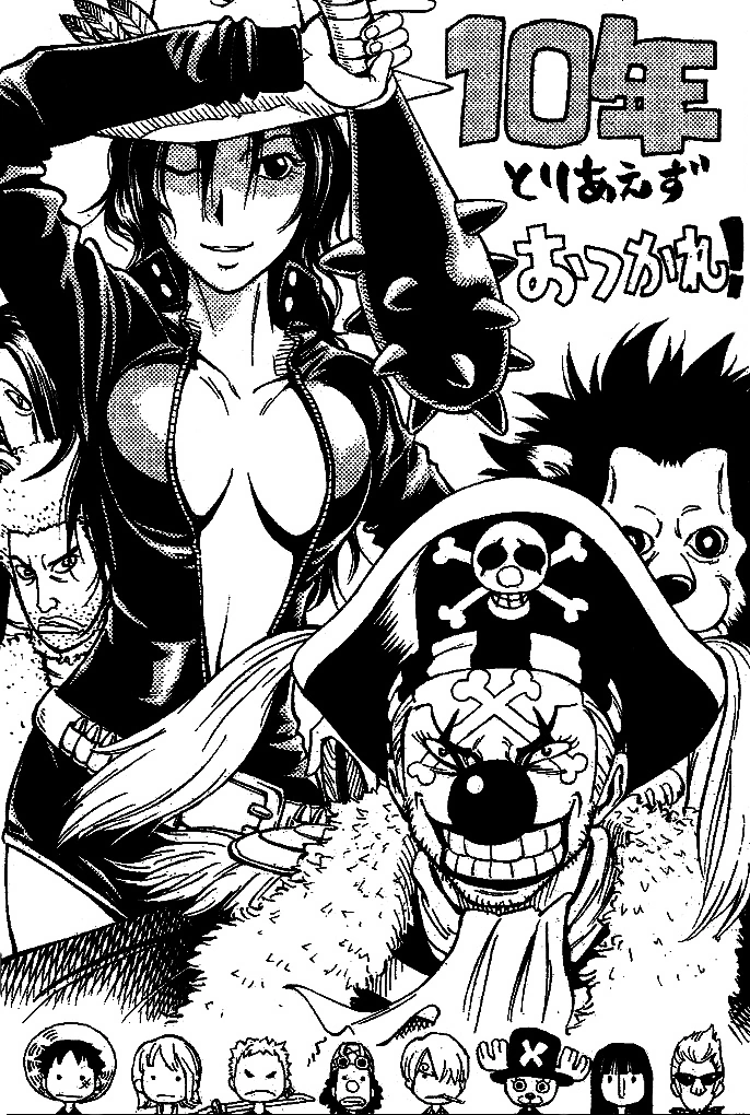 One Piece 10th Treasures est un livre de collection spécial sorti en 2007 pour célébrer le 10e anniversaire de One Piece . Il comprend de nombreux spoilers et informations générales, le crossover spécial One Piece x Dragon Ball ainsi que des concept arts d'Eiichiro Oda . Il existe également une section entière consacrée à l'art de One Piece réalisé par d'autres artistes de manga dans leurs styles artistiques.