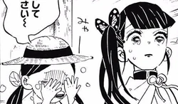 | Demon Slayer, Chapitre 70 | Sumi porte un chapeau de paille alors qu'elle regarde Uzui essayer d'enlever Aoi et Naho. |