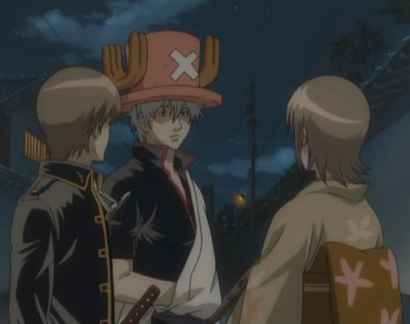Dans l'Épisode 86, en revenant de la Jump Festa, Gintoki a le chapeau de Chopper sur la tête. On peut également voir une petite figurine de Chopper dans le sac, les lunettes d'Usopp et Mitsuba a le tatouage de Nami sur la main.