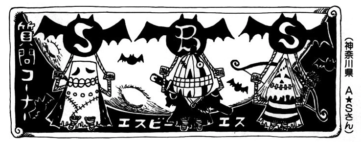 Bonjour, M. Oda ! Dites donc, j'ai découvert un truc à propos de Saldeath ! Dans le tome 54, lors de sa première apparition, j'ai remarqué que de petits points nois étaient disposés à intervalle régulier sur le manche de sa fourche, et un peu plus tard, lorsqu'il explique les pouvoirs de Mr 2, on dirait qu'il porte le manche à sa bouche. J'en déduis que sa fourche fonctionne comme une flûte dont le son sert à commander aux Blugori ! |
