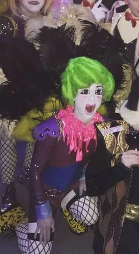 Satchin a un maquillage blanc épais sur son visage, avec de grands sourcils bruns broussailleux, un fard à paupières noir et un fard rose sur ses joues. Il a les cheveux verts bouclés coiffés vers le haut. Satchin porte une combinaison bordeaux et bleue avec des épaules violettes gonflées, un col rose à froufrous et des poignets argentés. Il porte également des bottes jaunes à imprimé guépard et un grand panache de plumes noires et jaunes sur le dos.[ 1]