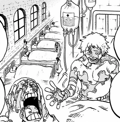 - ↑ One Piece Manga & Anime — Tome 77, Chapitre 764 et Épisode 703 : Les médecins ont peur d'être contaminés par Law.