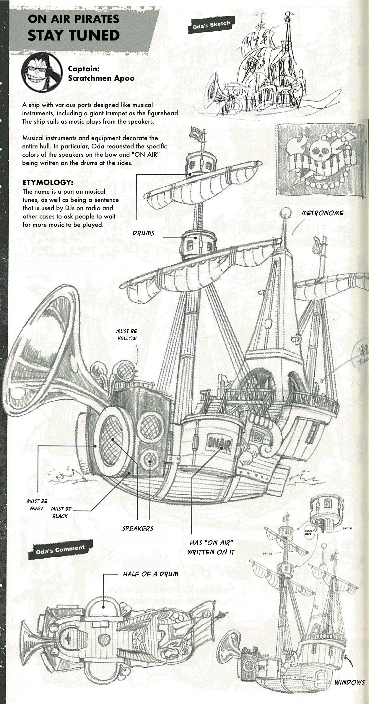 Stay Tune est un petit bateau brun avec un énorme cor en tant que proue et deux mâts, qui comprend deux voiles rouges. La partie basse comprend le Jolly Roger de l'Équipage, et la voile avant comporte des nids de corbeau ressemblant à des percussions avec le drapeau du Jolly Roger en haut. Le mât arrière comporte une voile rouge et un autre drapeau de Jolly Roger dessus. Le navire possède une cabine qui a la même forme qu'une tour radio, des enceintes audio à l'avant du navire et des percussions sur le côté avec "ON AIR" écrit dessus.