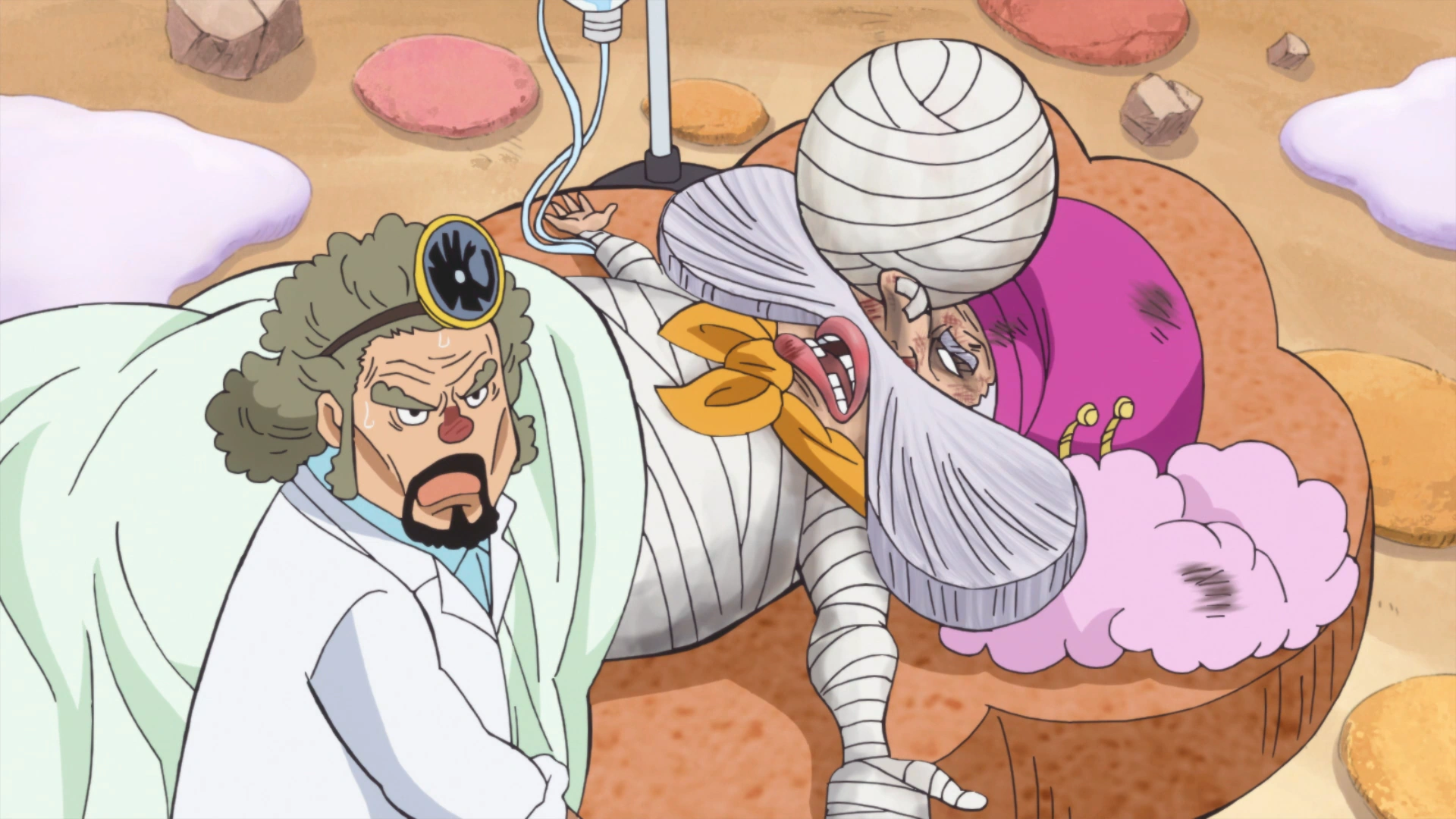 - ↑ One Piece Manga & Anime — Tome 87, Chapitre 873 et Épisode 844 : Streusen est soigné suite à ses graves blessures.
