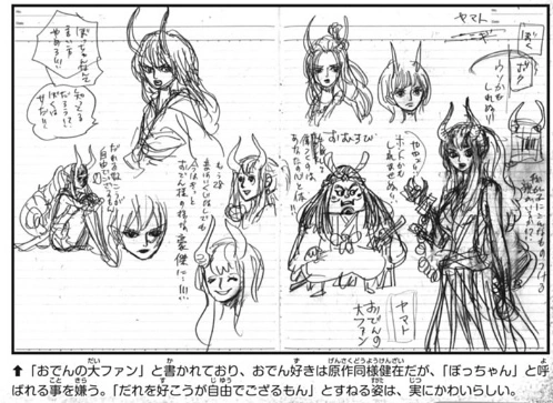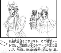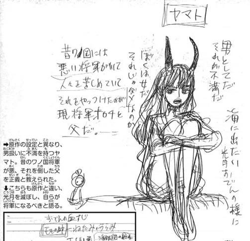 Kaidou parle d'elle comme d'un idiot.[16] Yamato est une grande admiratrice d'Oden Kozuki, un ancien grand ennemi de son père, au point de considérer le journal de bord d'Oden comme une bible, de s'identifier à lui et d'être déterminée à réaliser le but qu'il n'a pas pu achever, à savoir "ouvrir les portes du pays".[5] Pour cette raison bien qu'étant née femme, elle cache son apparence par un grand masque et des vêtements amples, et a fait en sorte que les personnes qui la connaissent, le prennent pour un homme, devenant ainsi le fils de Kaidou.