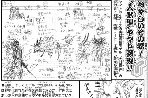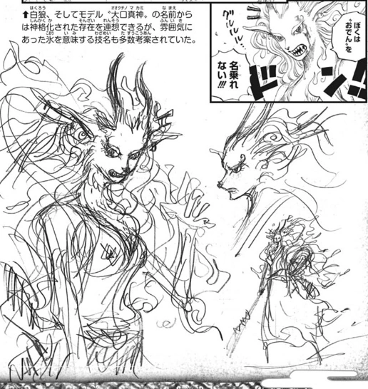 Yamato a mangé le Inu Inu no Mi, modèle Okuchi no Makami,[21] un Fruit de type Zoan Mythique que son père Kaidou avait récupéré, et l'a mangé par inadvertance parce qu'elle avait faim. Ce fruit lui permet de se transformer en "Ōkuchi-no-Magami", la déification du Loup de Honshū, une sous-espèce de loup éteinte et vivant au Japon, considérée comme protectrice des humains. Ce Fruit lui permet de générer un souffle destructeur, et ressemble à une créature avec des crocs,[18] un fin museau et une chevelure à l'apparence brumeuse.[22]
