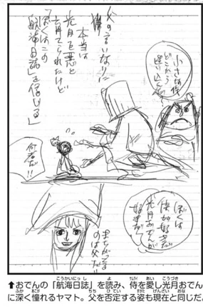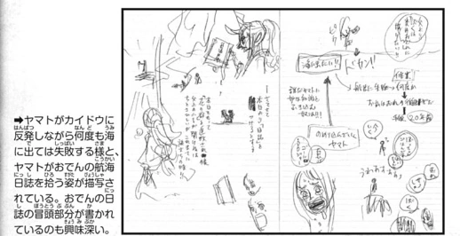 - ↑ One Piece Manga — Tome 111 Chapitre 1125, Mini-Aventure: Le Pèlerinage de Yamato, le Fils du Démon, Vol. 13 - "La reconstruction du château d'Oden et la disparition de Minatomo le maître charpentier"