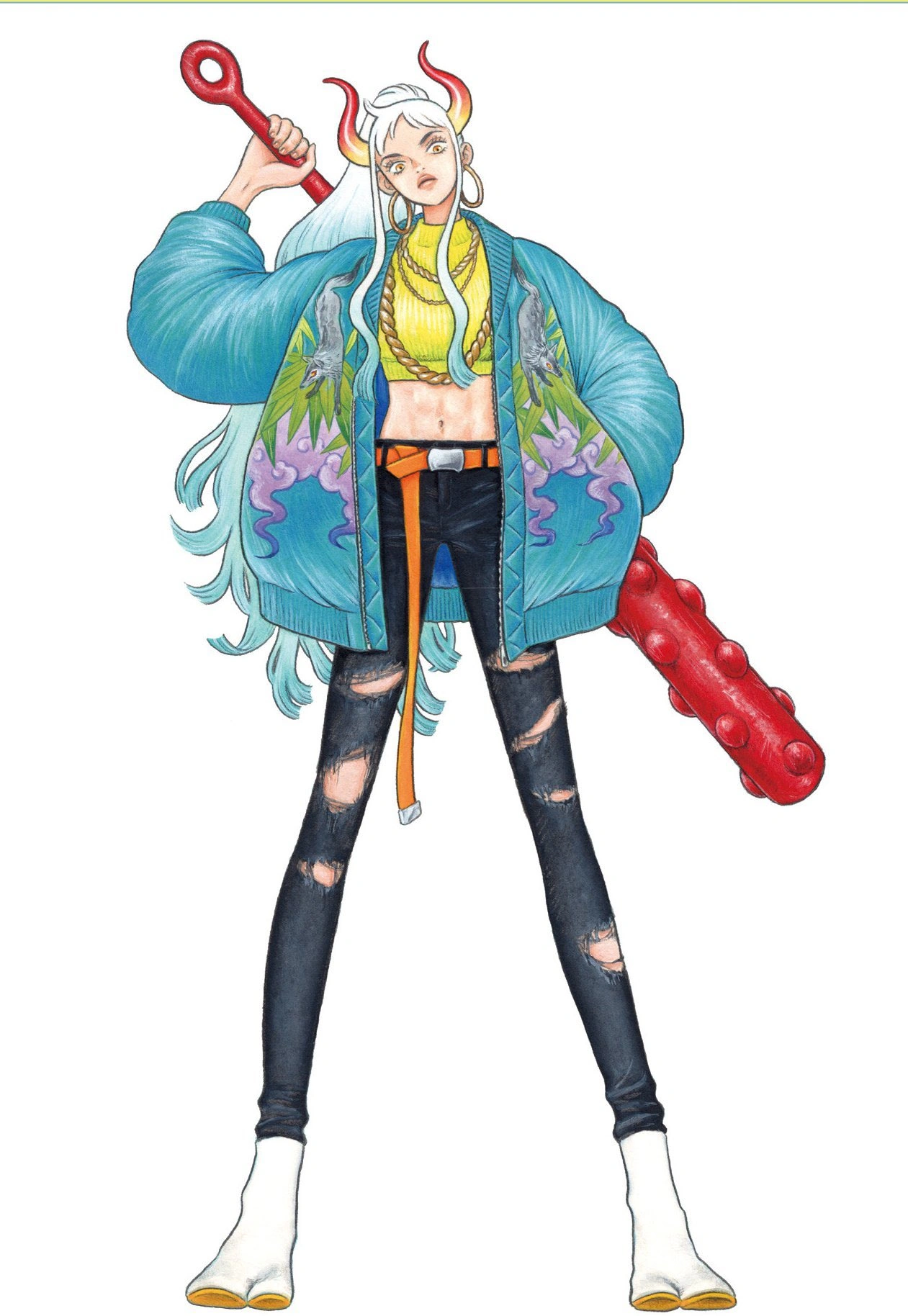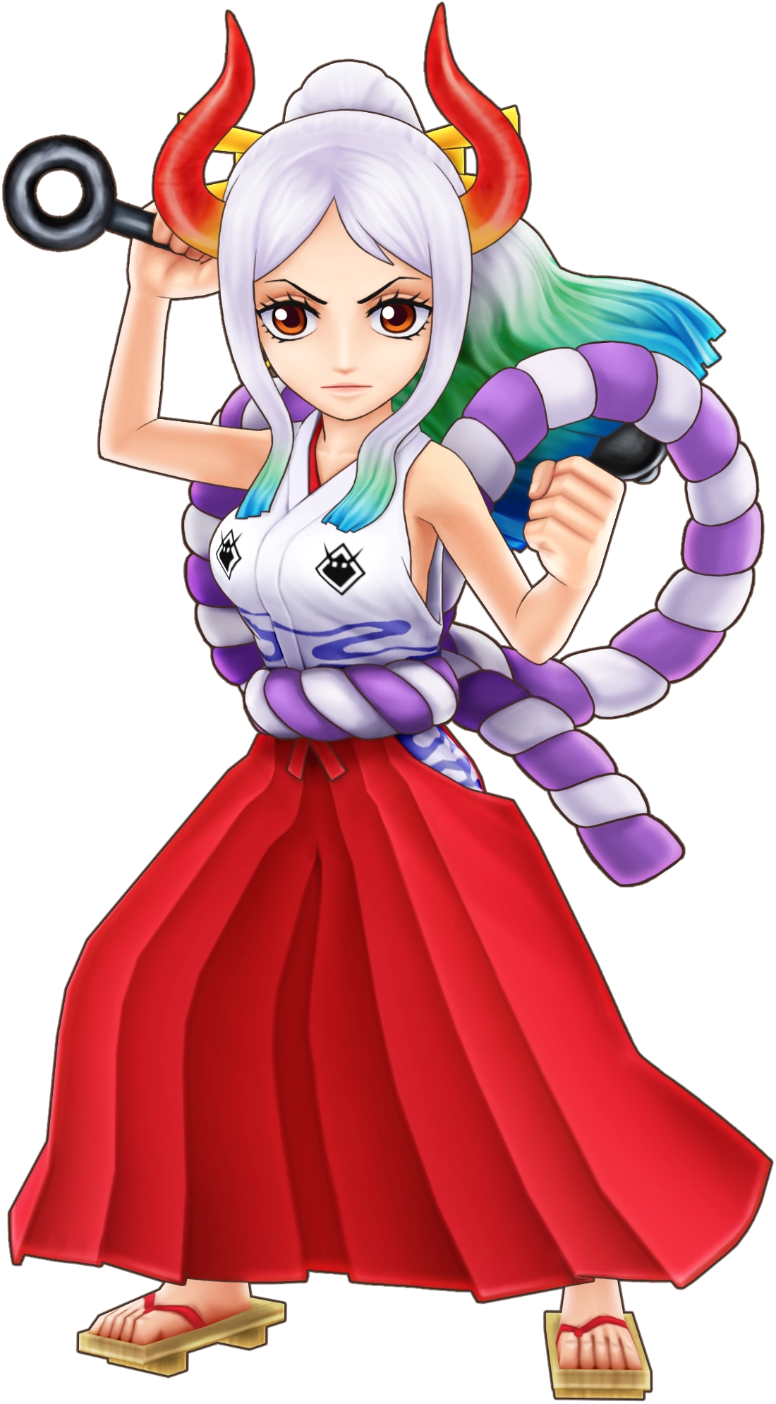 À l'instar de son père, Yamato possède un Kanabō, qui convient à sa taille. En conjonction avec sa force immense, elle a pu l'utiliser pour vaincre temporairement Ulti.[17] Ce kanabo est nommé Takeru,[26] Avec sa force, il peut être utilisé pour effectuer des frappes volantes qui peuvent même ressembler à de l'énergie explosions.[18] Yamato a une technique magistrale avec son kanabo, étant capable de le déplacer pour contrer les attaques rapides de Luffy avec peu d'effort.[5]