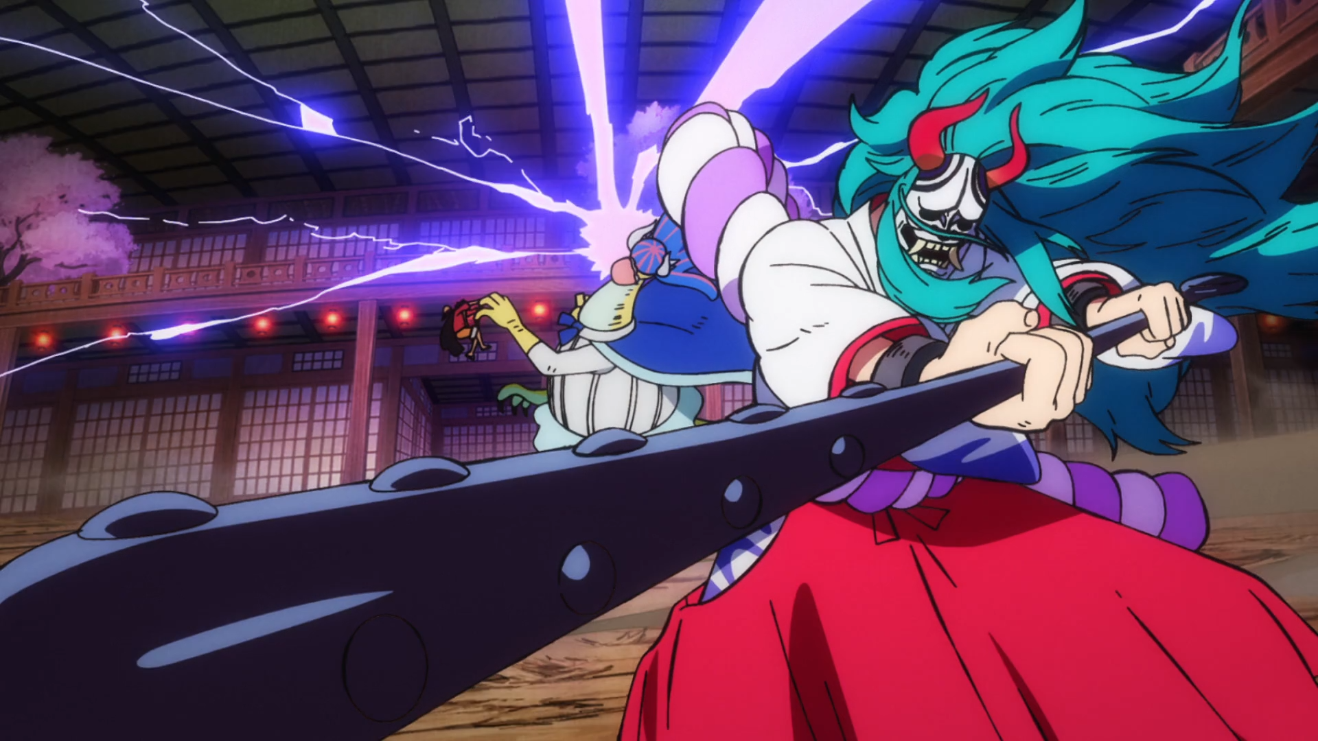 Alors que Sasaki se prépare à entrer dans la bataille, Yamato commence à se transformer, mais Franky arrive alors pourchassé par Hatcha. Ce dernier détruit le sol d'un coup de massue et Momonosuke, Shinobu et Yamato tombent dans le trou, Yamato en profitant pour battre Hatcha d'un seul coup de massue.[18]