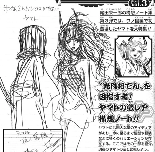 - ↑ De manière générale, le genre de Yamato est féminin quand un membre du staff One Piece la cite, incluant Oda, et masculin quand Yamato est citée dans le monde de One Piece. Il a ainsi été décidé de genrer Yamato au féminin dans cette encyclopédie, Oda la considérant comme une femme. Voir la section "Genre" pour plus d'informations.