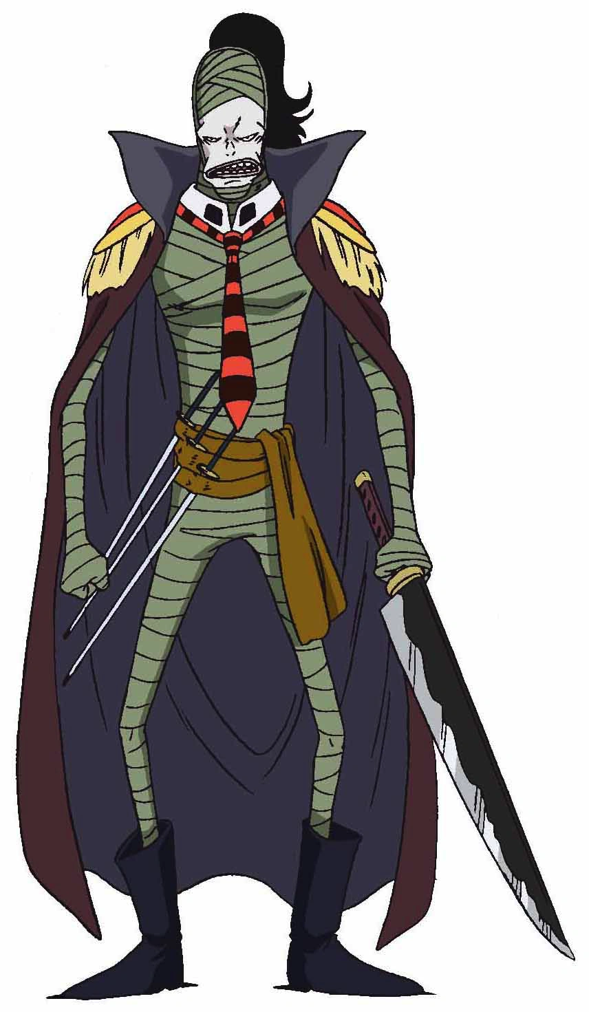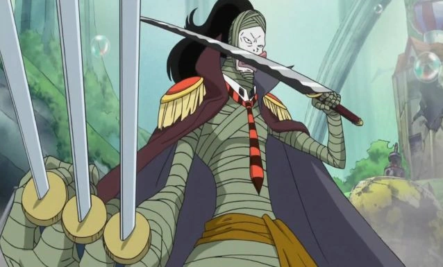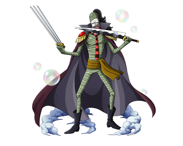Dia memiliki setidaknya empat senjata tajam, jadi dapat diasumsikan bahwa dia adalah seorang pendekar pedang. Dia terlihat memegang tiga belati di antara jari-jari tangan kanannya dan menggunakannya seperti cakar, mirip dengan gaya bertarung pisau Buggy. Dia menggunakan pedang melengkung di tangan kirinya.