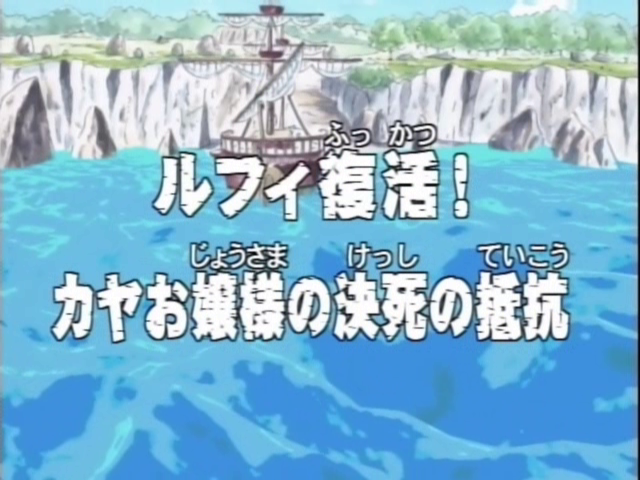 Kapten Kuro sendiri tiba di tempat kejadian, dan dengan Zoro yang terlalu terluka untuk bertarung, Luffy yang tidak berdaya, dan dua lainnya, Nami dan Usopp, yang terlalu lemah untuk menghadapinya, segalanya tampak tanpa harapan. Namun, Kaya sendiri tampaknya berunding dengan Kuro.