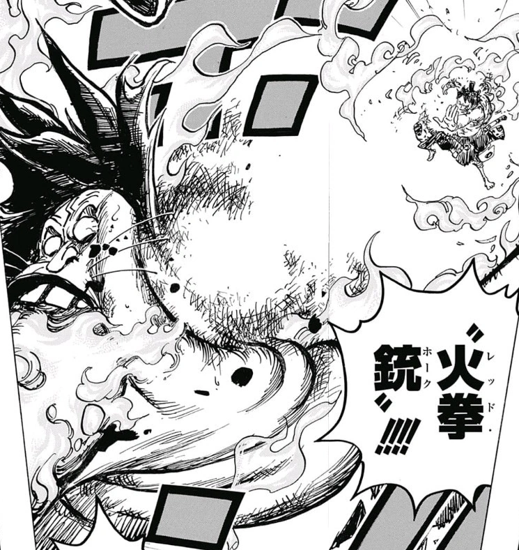 Luffy menyerang Holdem dengan Red Hawk.