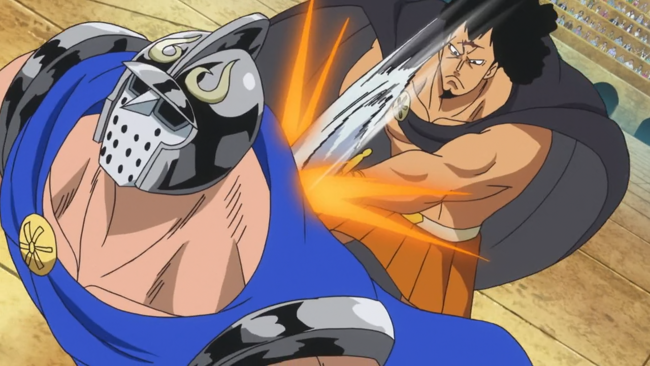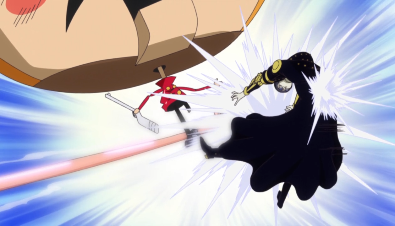 - Kyros (sebagai Prajurit Guntur) vs. Gladius (terganggu oleh Monkey D. Luffy)