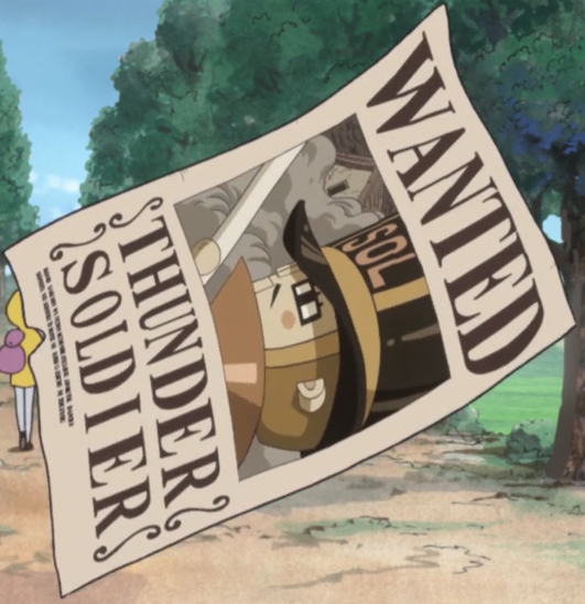 - ↑ Manga dan Anime One Piece — Vol. 72 Chapter 721 (p. 16) dan Episode 651, Poster buronan Prajurit Guntur ditampilkan.