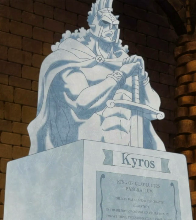- ↑ 6,0 6,1 6,2 6,3 Manga dan Anime One Piece — Vol. 71 Chapter 704 dan Episode 634, Rebecca menjelaskan tentang Kyros dan patungnya.