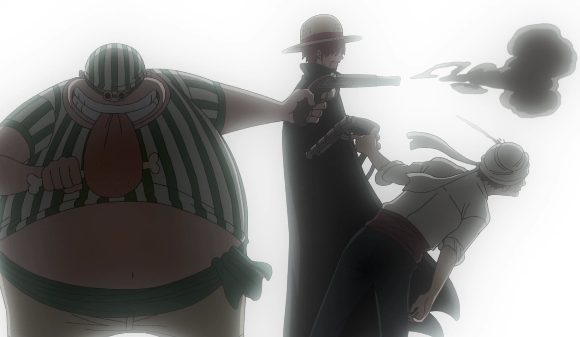Roux, Yasopp, dan Beckman menyaksikan kapten mereka bentrok dengan Shirohige.