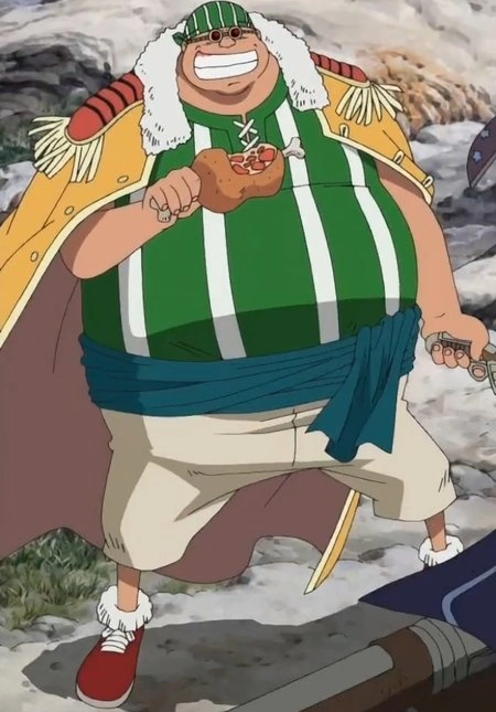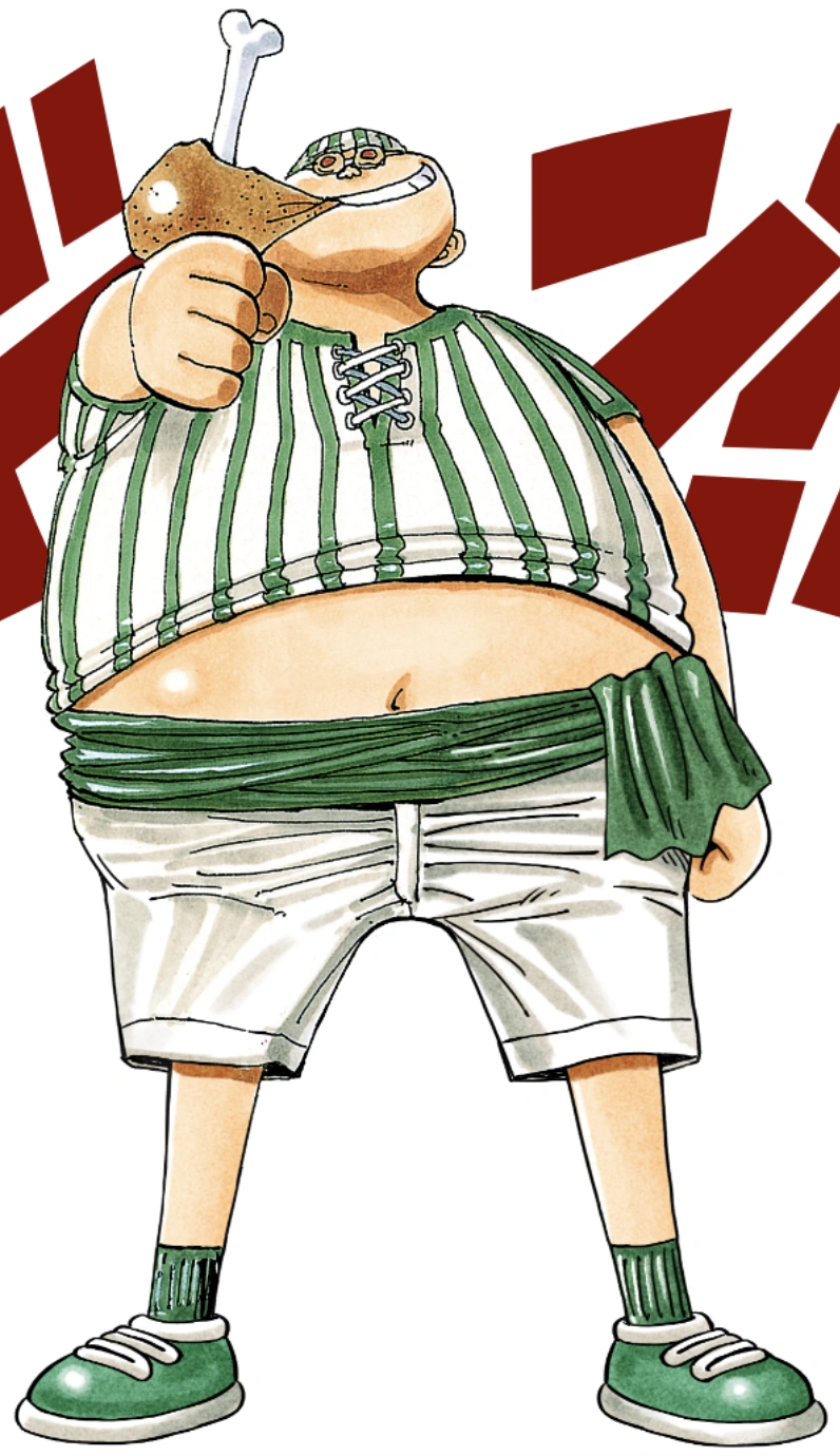 Dia memiliki nafsu makan yang sangat besar, dan, di manga, dia terlihat meminum satu tong penuh sake sendirian di latar belakang saat kru berada di bar Makino bekerja.[1] Dia hampir selalu ditampilkan dengan seringai lebar bahkan selama perang, memegang rak besar daging di setidaknya satu tangan, kecuali satu adegan di Episode 316, di mana dia memegang rel tanpa tanda daging.