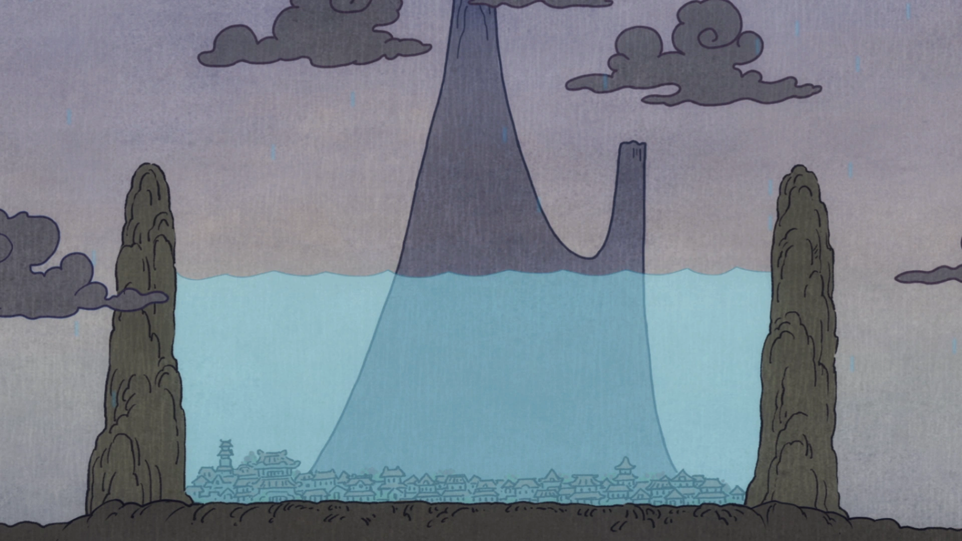 Tembok gunung Wano dengan air terjun sebagai satu-satunya jalan masuk ke negara itu.