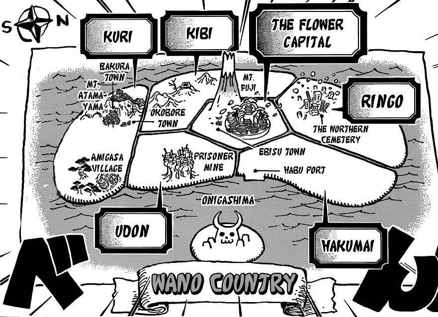 - ↑ 62,0 62,1 62,2 62,3 62,4 62,5 Manga dan Anime One Piece — Vol. 93 Chapter 934 (p. 6) dan Episode 929, Tata letak lengkap Negara Wano terlihat dan dijelaskan.