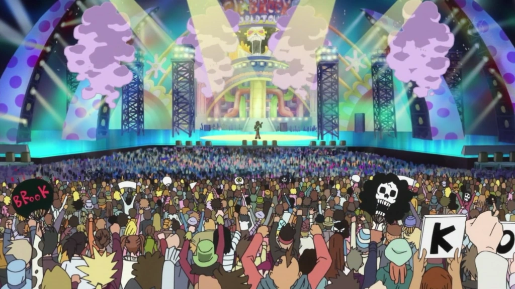 Setelah berkeliling di seluruh dunia, Brook datang ke sini untuk menggunakan tempat tersebut sebagai konser terakhirnya dan juga untuk penyatuan dengan krunya, Bajak Laut Topi Jerami. Di tempat ini Brook menyanyikan dua buah lagu yaitu New World dan Bone to be Wild .Dia mengatakan bahwa itu akan menjadi "konser terbaik"-nya. Setelah menyelesaikan konser dan berterima kasih kepada fans, mereka menyerukan (mengulangi) lagunya, yang dilakukan sampai acara itu terganggu oleh Angkatan laut yang datang untuk menangkapnya. Sancrin-lah yang telah melaporkan Brook sebagai bajak laut dan sebagai balas dendam karena brook pergi.