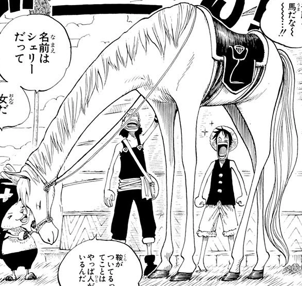 Saat mengunjungi Long Ring Long Land, Luffy, Usopp dan Tony Tony Chopper menemukan seekor kuda bernama Shelly di dekat sebuah rumah. Dia menunggu tuannya Tonjit kembali selama sepuluh tahun. Begitu Tonjit kembali, dia senang melihatnya. Namun, reuni itu terputus karena Foxy melukainya dengan senjatanya. Tindakan ini menyebabkan Luffy ikut serta dalam permainan Davy Back Fight.[1]