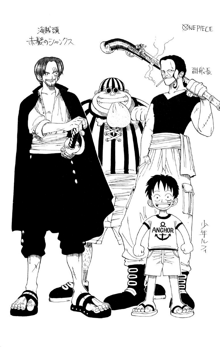 Gambar asli Shanks, Benn Beckman, Lucky Roux, dan Luffy Muda yang berdiri bersama dapat ditemukan.