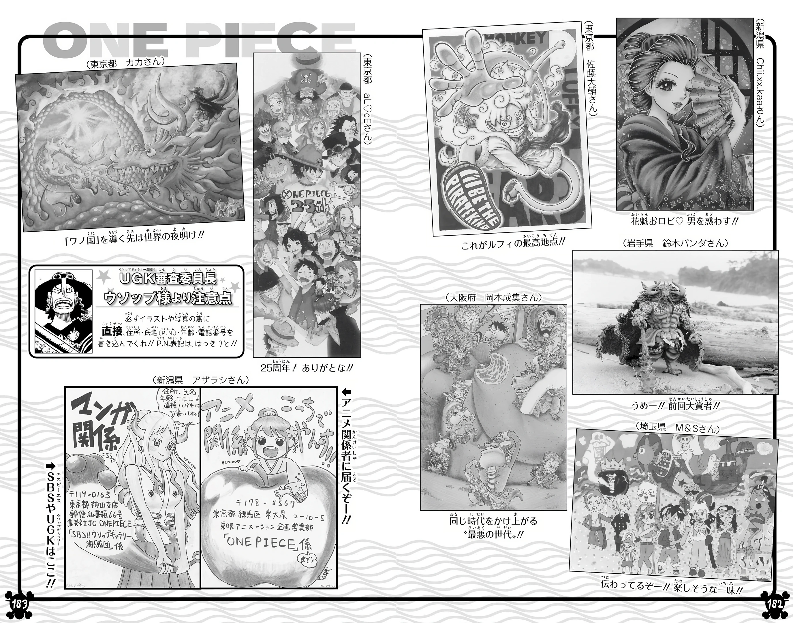 - 1050. Honor (誉れ, Homare?): Saat aliansi merayakan kemenangan mereka, Hiyori dan Denjiro bersiap untuk memperkenalkan Shogun baru dari Wano kepada masyarakat.
