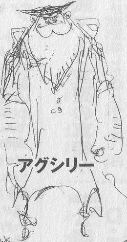 Agsilly è un uomo grande con la pelle abbronzata e una lunga barba castana. Indossa un cappotto, un tricorno nero, un mantello grigio, una camicia chiara e pantaloni che si abbinano alle sue piccole scarpe.