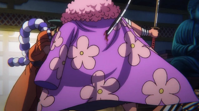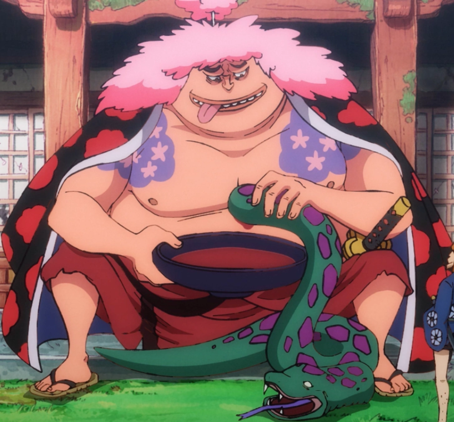Dopo che Rufy ha raggiunto il luogo dello scontro, chiede a Law di trasportare i feriti lontano dal campo di battaglia. Il pirata li fa così arrivare nella stanza del tesoro, dove poi qualcuno si prende cura di loro. Una volta che si sono ripresi, scoprono che sono stati bendati e si domanda chi sia stato. Sente Kawamatsu credere di avere visto un volto familiare, ma afferma che dev'essere stato un sogno. Kin'emon dice a tutti di andare dato che possono ancora combattere: a quel punto però la porta si apre e si trovano davanti il loro defunto signore, che dice loro di essere stati conciati per le feste e di essere invecchiati, cosa che li lascia increduli. Quest'ultimo rivela di avere viaggiato nel tempo grazie ai poteri di Toki, ma che ora non hanno tempo per festeggiare perché hanno un'altra possibilità di sconfiggere Kaido.