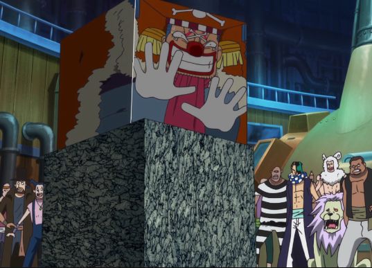La ciurma arriva in ritardo alla Fiera Mondiale Pirata e Bagy, vedendo Law ferito, lo attacca, ma quest'ultimo utilizza i suoi poteri per salire sulla Thousand Sunny. Raggiunta l'isola emersa da Delta, la Bagy's Delivery approfitta degli scontri per impossessarsi per primo del tesoro di Roger. A causa di una nave piena di esplosivi, precipita assieme all'isola.