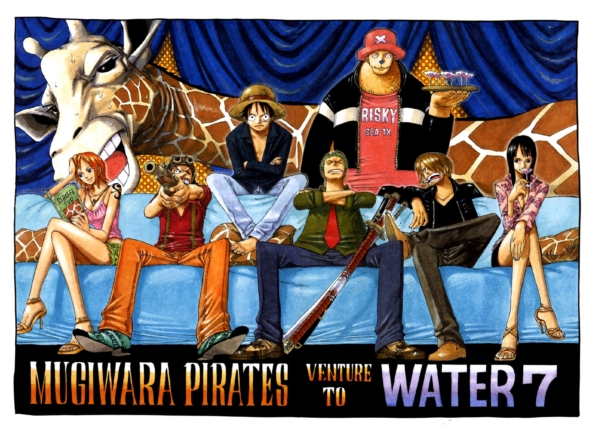 Cover a colori: la ciurma di Rufy in posa, seduta su un divano, e dietro di loro un'enorme giraffa.