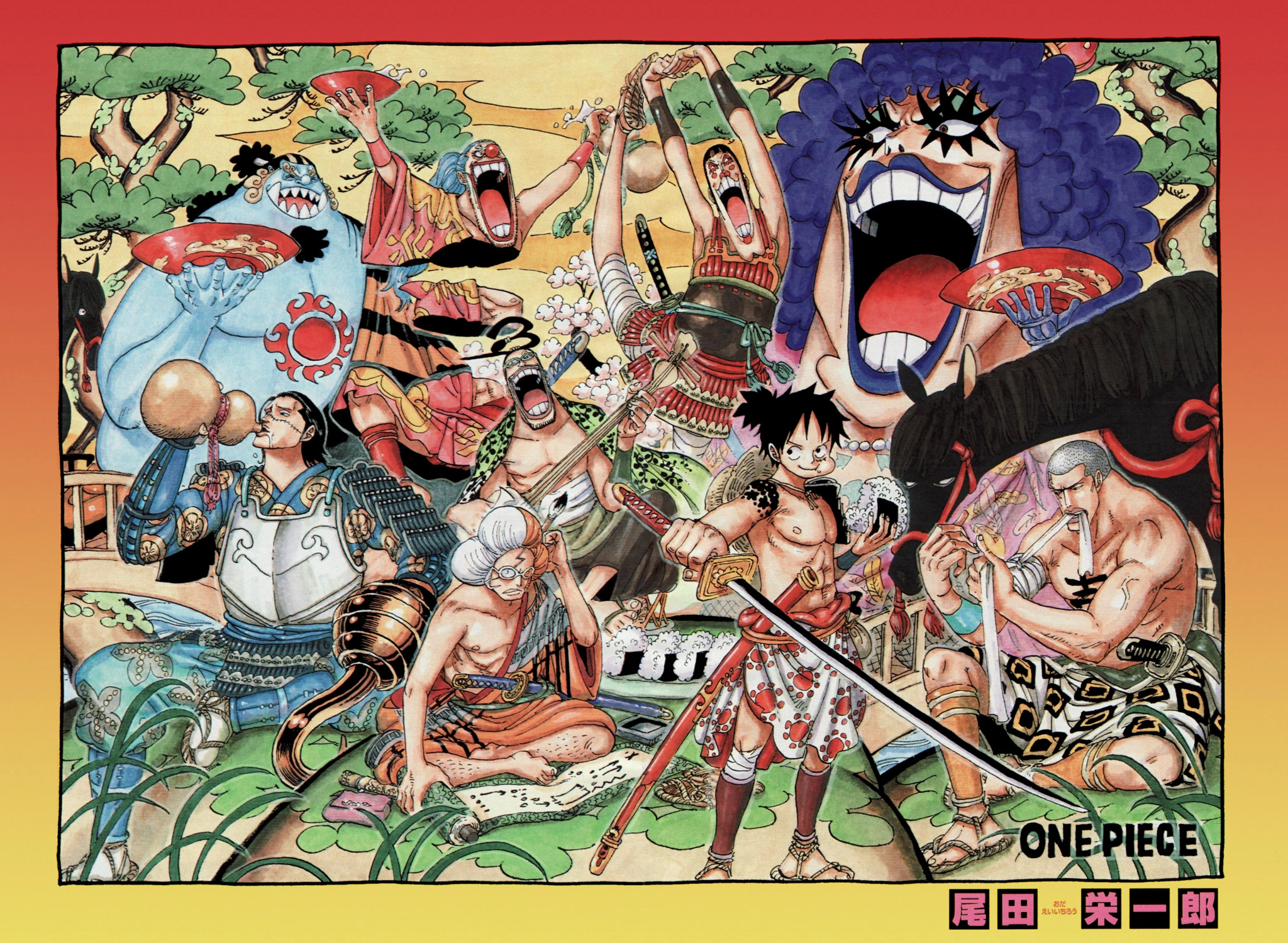 Cover a colori: gli evasi di Impel Down vestiti come samurai.