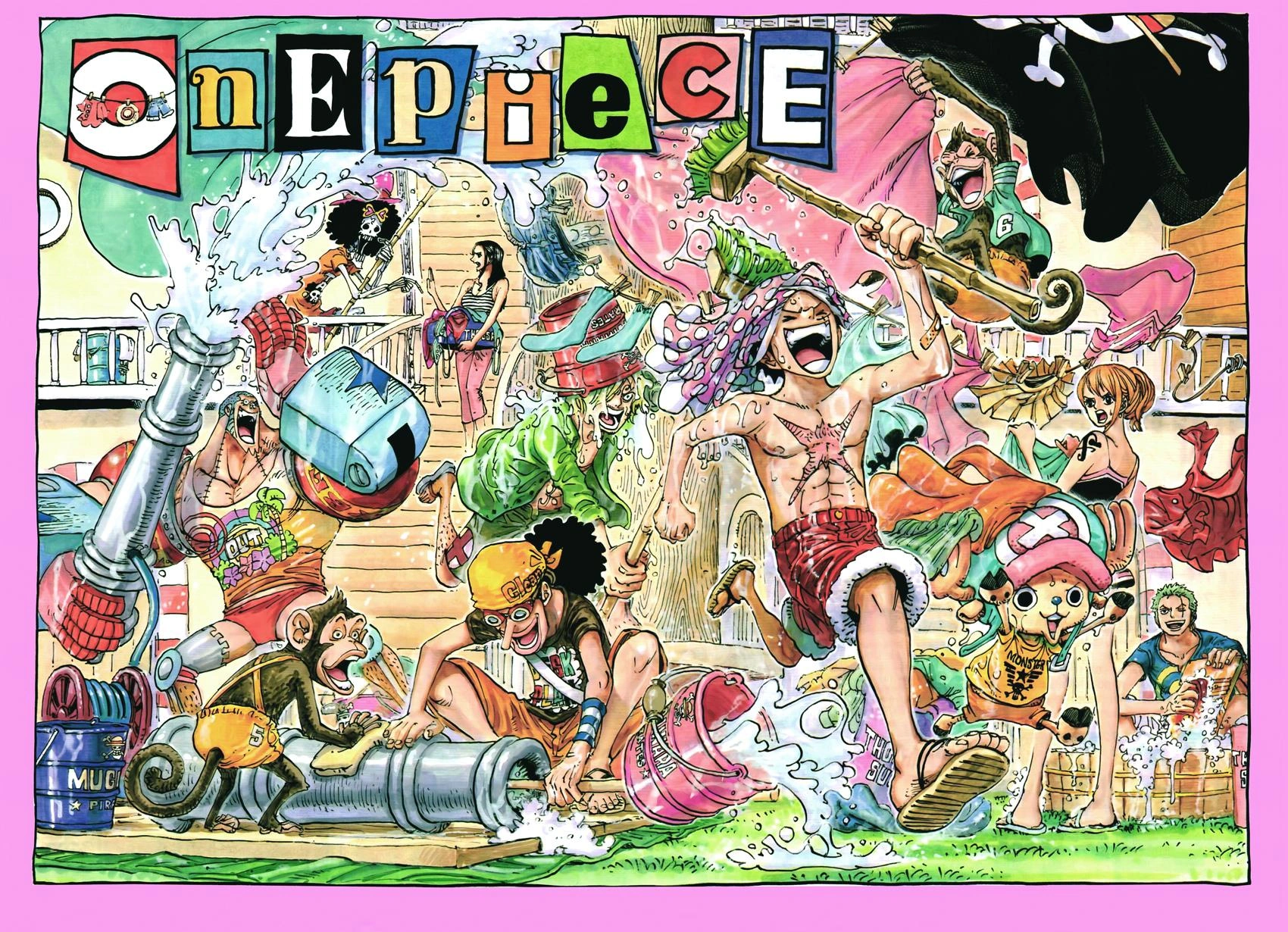 Cover a colori: la ciurma di Rufy ed alcune scimmie si divertono mentre fanno il bucato.