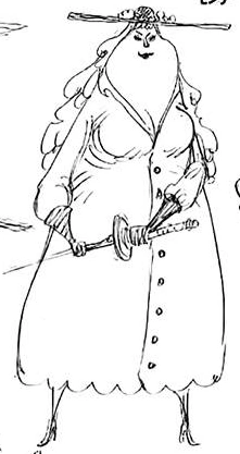 È una donna in sovrappeso con capelli azzurri e mossi. Nonostante sia per metà una Collo-di-serpente,[1] le dimensioni del suo collo sono tali da nascondere tale segno distintivo. Porta il rossetto e indossa un lungo vestito giallo, un cappello nero ornato da alcuni fiori rosa dalla tesa molto larga e dei guanti marroni.