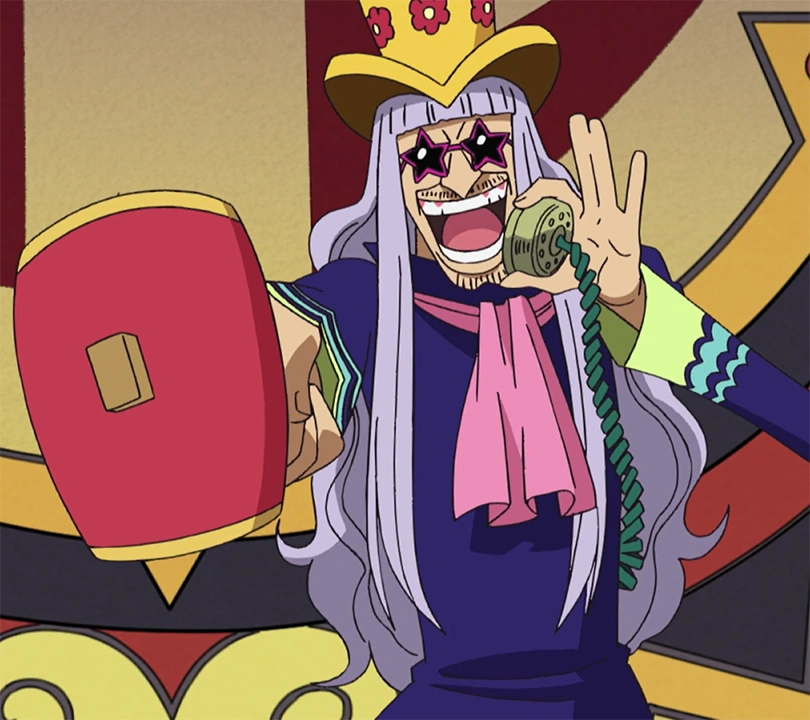 In seguito, ferito, telefona a Do Flamingo, il proprietario dell'edificio, per chiedergli di intervenire. Il pirata però gli dice che la casa d'aste non va più di moda, regalandogliela, dato che ha cose più interessanti a cui pensare, come gli Smile e all'imminente guerra tra la Marina e i Pirati di Barbabianca, per la quale sono stati convocati i membri della Flotta dei sette.