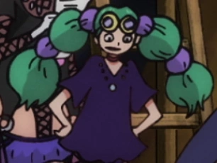 È una donna di bassa statura con il rossetto, le ciglia folte e lunghi capelli verdi legati in due trecce tramite dei grandi elastici viola. Indossa dei grandi occhiali con la montatura gialla, che tiene sulla fronte, un vestito blu, una collana di pelle nera, delle calze a rete e scarpe con il tacco.