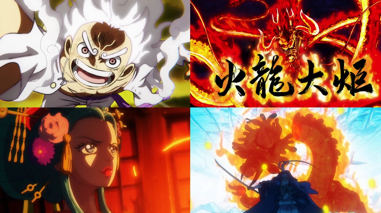 Kaido dichiara che incasserà l'attacco di Rufy, menziona la morte di Oden e si ricopre di fiamme, così l'avversario è costretto a lasciarlo poiché si è bruciato la mano e afferma che ha imparato come colpirlo senza toccarlo. Il seguente scambio di attacchi genera un'onda d'urto particolarmente potente.