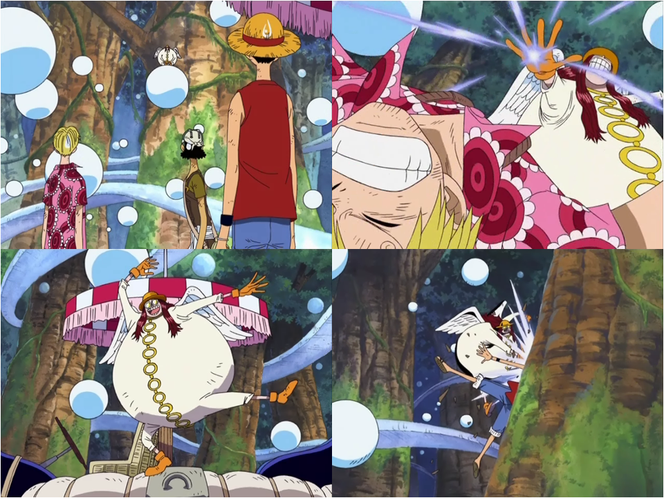 Rufy, Sanji e Usop scelgono di affrontare la prova della sfera. Al termine del tunnel si ritrovano in un'altra zona della foresta in cui galleggiano moltissime sfere a mezz'aria. La navigazione procede senza intoppi finché comprendono che le sfere sono piene di trappole come serpenti ed esplosivi e che è molto difficile evitare di scontrarsi con esse. Inoltre il sacerdote Satori si presenta di fronte ai tre pirati.