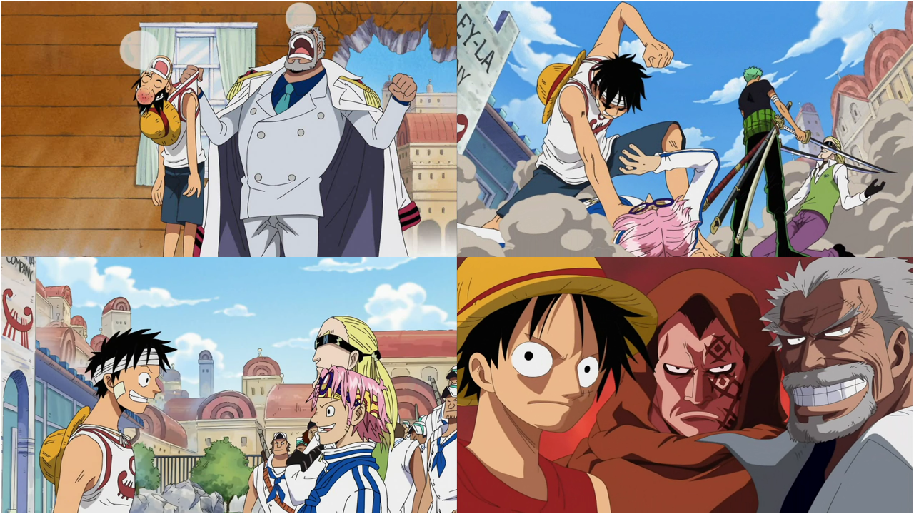 Rufy ordina alla ciurma di non provare ad attaccare suo nonno Garp, che in passato l'ha quasi ucciso centinaia di volte. L'uomo sostiene di averlo fatto per farlo diventare più forte e trasformarlo in un grande marine, anche se il fatto che Rufy da bambino abbia conosciuto Shanks ha rovinato i piani di Garp. Il viceammiraglio gli spiega anche che il Rosso è uno degli imperatori, i quattro pirati più potenti al mondo.