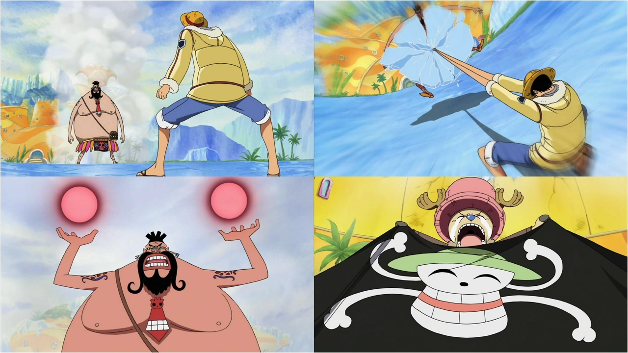 Rufy usa del ghiaccio per proteggere le mani dal corpo incandescente del nemico e lo colpisce violentemente. Puzzle sconfigge Campaccino; i suoi compagni invece decidono di passare al contrattacco ed iniziano di inseguire gli animali, eliminandoli uno dopo l'altro.