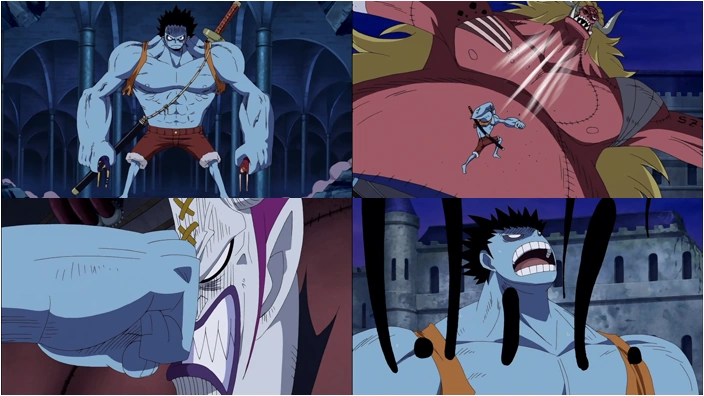 Rufy inizia a colpire il nemico allo stomaco, il punto in cui risiede Moria, finché il gigante si schianta contro un edificio. A quel punto, Rufy crolla a terra e le ombre escono dal suo corpo, tornando ai loro legittimi proprietari.
