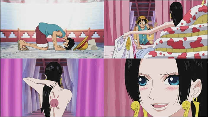 Sandersonia e Marigold chiedono perdono alla sorella per essere state sconfitte. Rufy chiede ad Hancock di ritrasformare in persone le statue delle tre Kuja che lo hanno aiutato e la donna gli sottopone una scelta: salvare le tre donne o ottenere una barca per salpare e raggiungere i suoi compagni. Rufy senza esitare chiede che le tre donne tornino normali. Hancock, stupita, esaudisce la sua richiesta e poi lo porta con sé al palazzo reale.