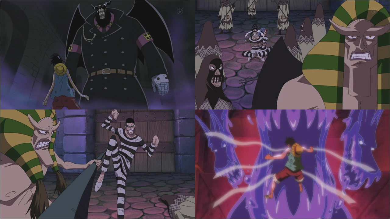 Al piano inferiore, Rufy soffre terribilmente per colpa del veleno che gli ricopre le mani, ma non è intenzionato ad arrendersi. Lo scontro prosegue e Magellan ricorre ancora al suo potere per colpire nuovamente l'avversario. Il ragazzo non riesce a difendersi e progressivamente inizia a perdere la vista e l'udito, fino a crollare a terra.