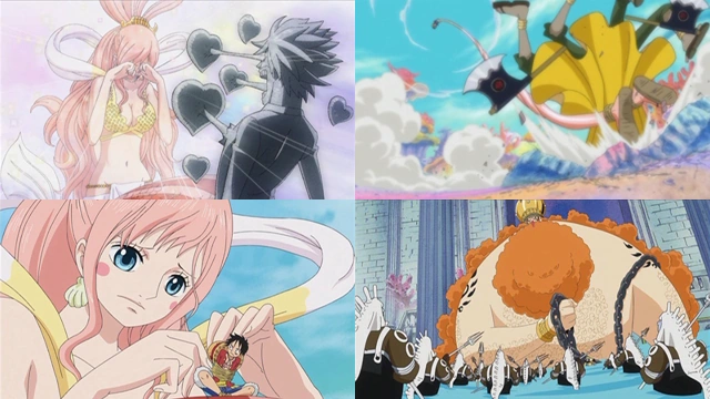 Rufy viene accusato del rapimento di Shirahoshi e legato insieme ad Hacchan e ai suoi compagni. Decken giunge subito dopo sul posto e chiede alla principessa di sposarlo, che rifiuta perché dice che non è il suo tipo; il pirata cerca così di ucciderla, ma viene fermato da Rufy che riesce a metterlo al tappeto nonostante sia legato. Shirahoshi slega Cappello di paglia e i due sfuggono alla folla insieme a Megalo, Sanji, Chopper ed Hacchan, ma vengono intercettati da Wadatsumi. Rufy interviene nuovamente e lo colpisce approfittandone per allontanarsi. Al palazzo del drago, intanto, Zoro riesce a sconfiggere Hody Jones con un colpo di spada al petto.