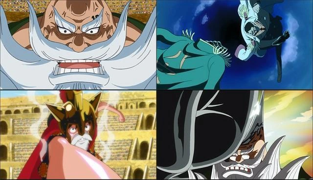 - Rufy fa i complimenti a Chinjao per la sua forza, e quest'ultimo si sente insultato;
