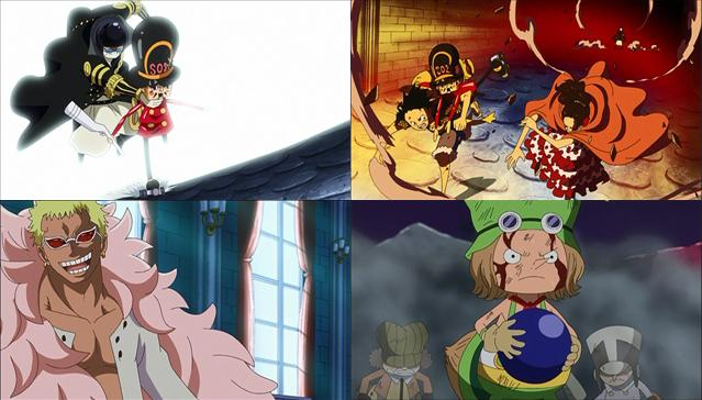 Rufy, Viola e il rabbioso soldatino tonante raggiungono il piano su cui si trova Do Flamingo e la ragazza chiede a Cappello di paglia di attendere finché l'operazione O.S.S. sia portata a termine. All'interno della stanza, Do Flamingo riflette sulle mosse dei Pirati di Cappello di paglia e Law sostiene di non sapere nulla di quanto sta accadendo.