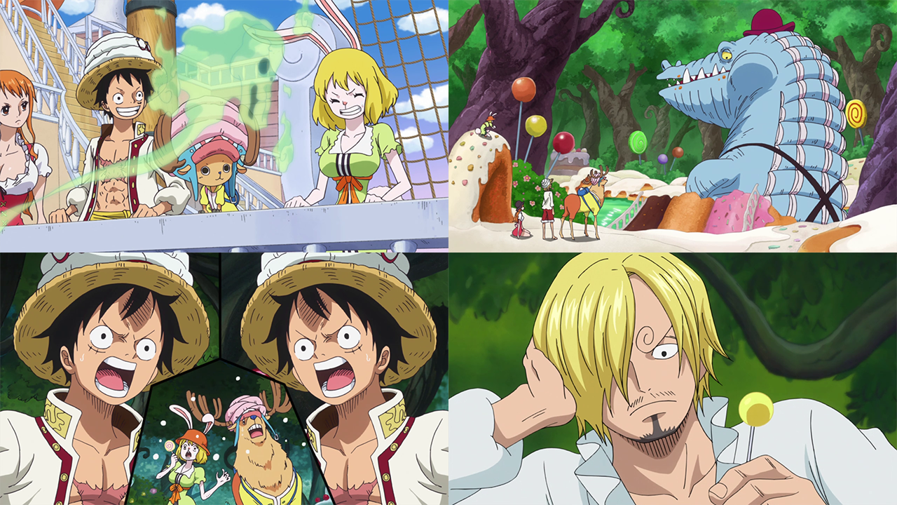 Il gruppo di Rufy sbarca sull'isola e avvista di nuovo Sanji, un po' più lontano. Rufy e Chopper partono al suo inseguimento e si inoltrano in una foresta, subito seguiti da Carrot e Nami, ma Sanji continua a scomparire dalla loro vista. La foresta è completamente fatta di dolci e per questo Rufy, Chopper e Carrot si esaltano nel mangiare tutto quello che trovano. Ad un certo punto un gigantesco coccodrillo mangia il ponte su cui i quattro si trovano: si tratta di un animale parlante e che indossa vestiti, che subito dopo si allontana pacificamente.